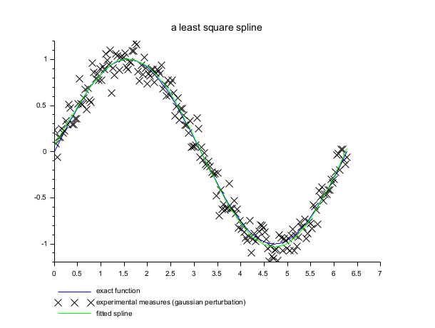 // this is an artificial example where the data xd and yd // are build from a perturbed sin function a = 0; b = 2*%pi; sigma = 0.1; // standard deviation of the gaussian noise m = 200; // number of experimental points xd = linspace(a,b,m)'; yd = sin(xd) + grand(xd,"nor",0,sigma); n = 6; // number of breakpoints x = linspace(a,b,n)'; // compute the spline [y, d] = lsq_splin(xd, yd, x); // use equal weights // plotting ye = sin(xd); ys = interp(xd, x, y, d); clf() plot2d(xd,[ye yd ys],style=[2 -2 3], ... leg="exact function@experimental measures (gaussian perturbation)@fitted spline") xtitle("a least square spline") show_window()