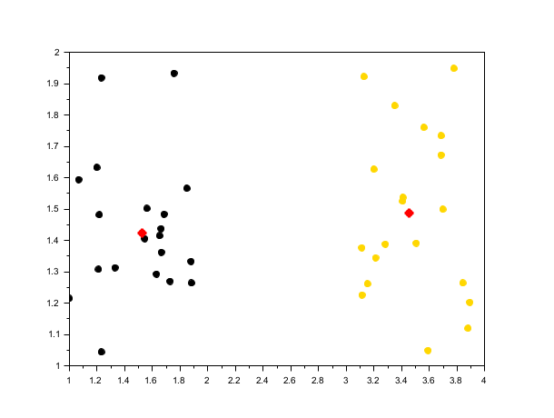rand("seed", 0) n = 20; X1 = [rand(n, 2) + 1; rand(n, 2) + 5]; [centers1, labels1] = meanshift(X1, 1); scf(); scatter(X1(:,1), X1(:,2), [], labels1, "fill"); plot(centers1(:,1), centers1(:,2), 'r*', "markersize", 10, "thickness", 3);