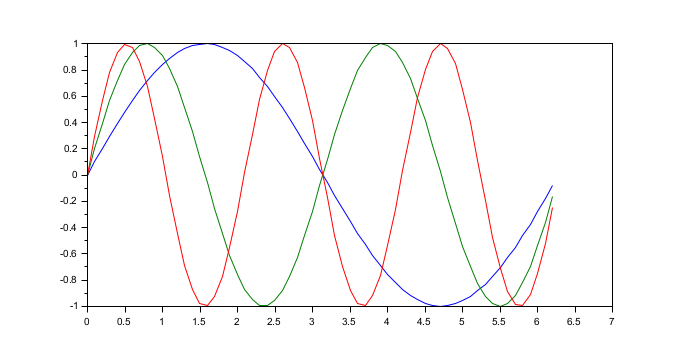 clf t = -%pi:%pi/20:2*%pi; // sin() : in Red, with O marks, without line // cos() : in Green, with + marks, with a solid line // gaussian: in Blue, without marks, with dotted line gauss = 1.5*exp(-(t/2-1).^2)-1; plot(t,sin,'ro', t,cos,'g+-', t,gauss,':b')