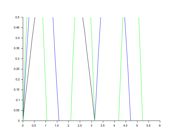 plot2d(x,[sin(x) sin(2*x) sin(3*x)],rect=[0,0,6,0.5]);