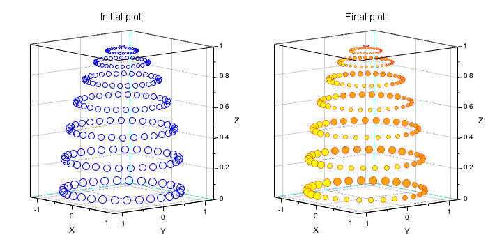 // Data: points on an hemisphere azimuth = 0:12:359; latitude = 3:12:89; [az, lat] = ndgrid(azimuth, latitude); r = cosd(lat); x = 1.1*cosd(az+lat/3) .* r; y = 1.1*sind(az+lat/3) .* r; z = sind(lat); clf subplot(1,2,1) scatter3d(x, y, z, r.^2*80); title("Initial plot", "fontsize",3) subplot(1,2,2) p = scatter3d(x, y, z, r.^2*80); // The same title("Final plot", "fontsize",3) // Let's post-process it through the handle: // 1) Let's set all markers at y < 0 in yellow, and others in orange np = size(p.data,1); // number of points tmp = ones(1,np) * color("orange"); tmp(p.data(:,2)<0) = color("yellow"); p.mark_background = tmp; // 2) and markers at x > 0 1.4 smaller than other tmp = p.data(:,1) > 0; p.mark_size(tmp) = p.mark_size(tmp)/1.4; // 3) Changing the edge color and thickness for all markers p.mark_foreground = color("red"); p.thickness = 0.5; // Tuning axes Axes = gcf().children; Axes.rotation_angles = [82, -40]; Axes.grid = [1 1 1]*color("grey60");