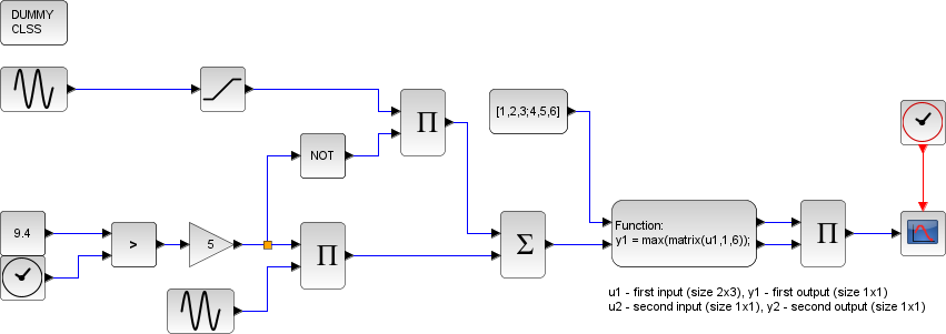 This block can realize any type of Scicos block. The function of the block is defined interactively using dialogue boxes and in Scilab language. During simulation, these instructions are interpreted by Scilab; the simulation of diagrams that include these types of blocks is slower. For more information see Scicos reference manual.