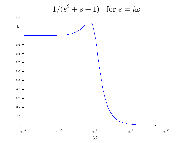 title("$\LARGE \left|1/(s^2+s+1)\right|\mbox{ for }s=i\omega$")