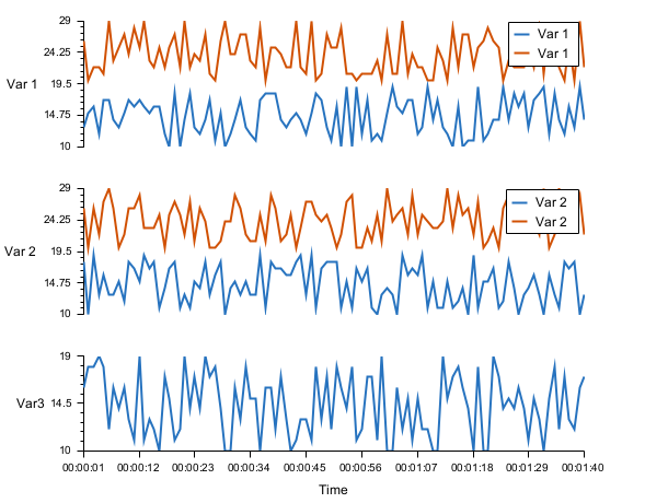 n = 100; t = seconds(1:n)'; y1 = floor(10 * rand(n, 3)) + 10; ts1 = timeseries(t, y1(:, 1), y1(:, 2), y1(:, 3), "VariableNames", ["Time", "Var 1", "Var 2", "Var3"]); y2 = floor(10 * rand(n, 2)) + 20; ts2 = timeseries(t, y2(:, 1), y2(:, 2), "VariableNames", ["Time", "Var 1", "Var 2"]); stackedplot(ts1, ts2);