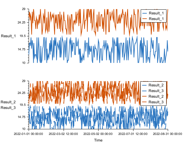 t = datetime(2022, 1, 1):datetime(2022, 8, 31); n = size(t, "*"); y1 = floor(10 * rand(n, 3)) + 10; ts1 = timeseries(t, y1(:, 1), y1(:, 2), y1(:, 3), "VariableNames", ["Time", "Result_1", "Result_2", "Result_3"]); y2 = floor(10 * rand(n, 3)) + 20; ts2 = timeseries(t, y2(:, 1), y2(:, 2), y2(:, 3), "VariableNames", ["Time", "Result_1", "Result_2", "Result_3"]); stackedplot(ts1, ts2, ["Result_1", "Result_3"]); stackedplot(ts1, ts2, [1 3]); stackedplot(ts1, ts2, {"Result_1", ["Result_2", "Result_3"]});
