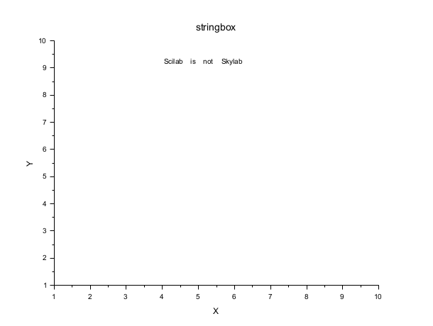 // show axes axes = gca() ; axes.axes_visible = 'on' ; axes.data_bounds = [ 1, 1 ; 10, 10 ] ; // display a labels for axes xtitle( 'stringbox', 'X', 'Y' ) ; // get the bounding box of X label stringbox( axes.x_label ) // draw a string str = [ "Scilab", "is" , "not", "Skylab" ] ; e = xstring( 4, 9, str ) ; //modify the text e.font_angle = 90 ; e.font_size = 6 ; e.font_style = 7 ; e.box = 'on' ; // get its bounding box stringbox( e ) // or rect = stringbox( str, 4, 9, 90, 7, 6 ) // click and find if the text was hit hit = xclick() ; hit = hit( 2 : 3 ) ; if hit(1) >= rect(1,1) & hit(1) <= rect(1,2) & hit(2) <= rect(2,2) & hit(2) >= rect(2,3) then disp('You hit the text.') ; else disp('You missed it.') end;