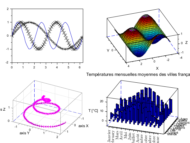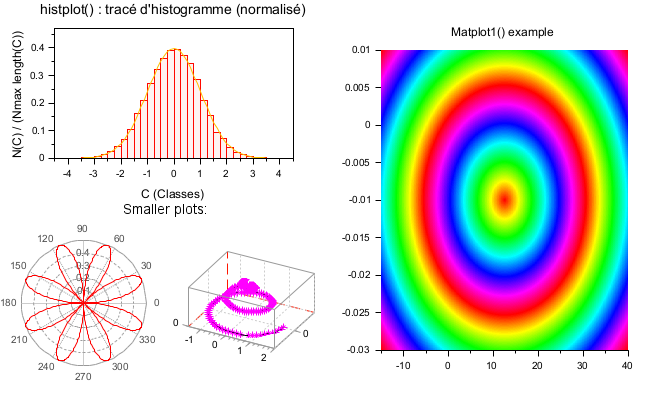 clf subplot(1,2,2) Matplot1() xtitle("Matplot1() example","","") subplot(2,2,1) histplot delete(findobj("type","Legend")) subplot(2,2,3) title("Smaller plots:", "fontsize",3) subplot(2,4,5) polarplot() subplot(2,4,6) param3d() xtitle("","","","")