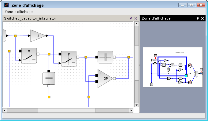 Ci-dessus, vous avez un exemple de la vue Aperçu incluse dans la fenêtre Xcos utilisée pour agrandir une partie du schéma. Sur la gauche, la fenêtre d'édition présente la partie agrandie du schéma.