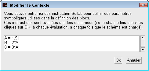 Ces instructions seront évaluées à chaque chargement du schéma. Si vous changez la valeur d'un paramètre symbolique Xcos dans le contexte, tous les blocs qui le contiennent sont mis à jour quand vous cliquez sur OK. Par exemple si vous voulez mettre la valeur de gain de plusieurs blocs à une valeur dépendant d'une seule valeur, vous pouvez procéder comme suit