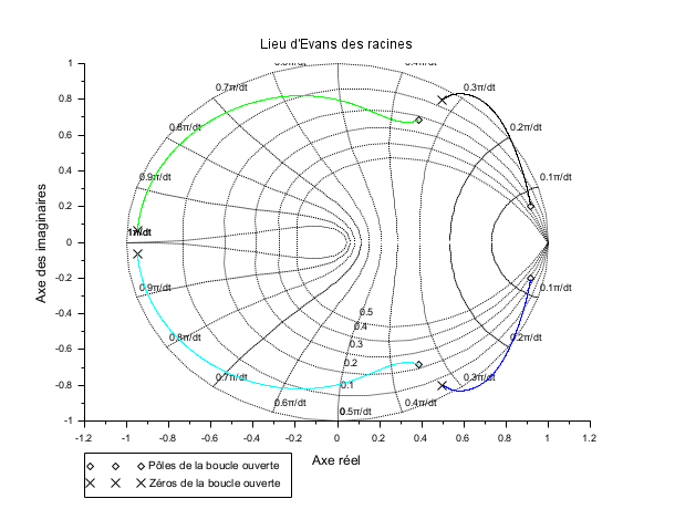//zgrid with discrete time system root locus z=poly(0,'z') H=syslin(0.01,(0.54-1.8*z+2.9*z^2-2.6*z^3+z^4)/(0.8+0.78*z-0.1*z^2+0.9*z^3+z^4)) clf();evans(H,1000);zgrid(0:0.1:0.5)