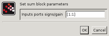 This block performs addition or soustraction on its scalar or vector inputs.The user can adjust the gain for each input with the parameter Inputs ports signs/gain. The behavior of the block is summarized in the following table :