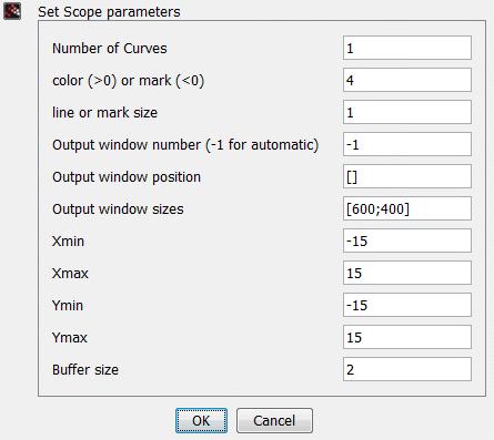 The number of graphic window used for the display. It is often good to use high values to avoid conflict with palettes and Super Block windows. If you have more than one scope, make sure they do not have the same window numbers (unless superposition of the curves is desired).