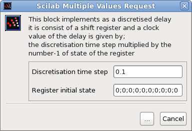 This compiled super-block implements a discretized delay. It is built with a shift register and a clock. The value of the delay is given by the discretization time step multiplied by the number-1 of state of the register.