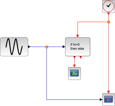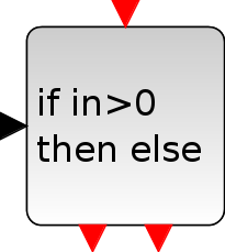 One event is generated on one of the output event ports when an input event arrives. Depending on the sign of the regular input, the event is generated on the first or second output. This is a Synchro block, , input and output event are synchronized.