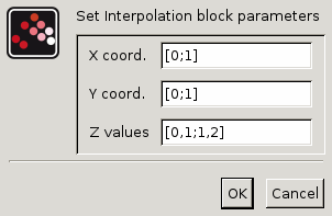 The output of this block is a function of the inputs obtained by bilinear interpolation. This block has two scalar inputs and a single scalar output. The X(i) and Y(i) give respectively the X coordinate and the Y coordinate of the i-th data point to be interpolated and Z(Y(i),X(i)) its value.