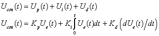 PID 則は入力変数 Up(t), その時間積分 Ui(t), その1階微分 Ud(t) の線形結合です. 制御則 Ucon(t) は以下の形式を有します: