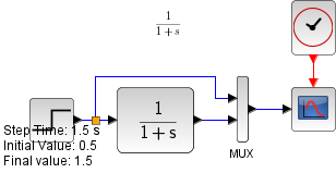 This diagram shows the use of the STEP_FUNCTION block to obtain the response to a step signal of a first order's system defined by a transfer function.