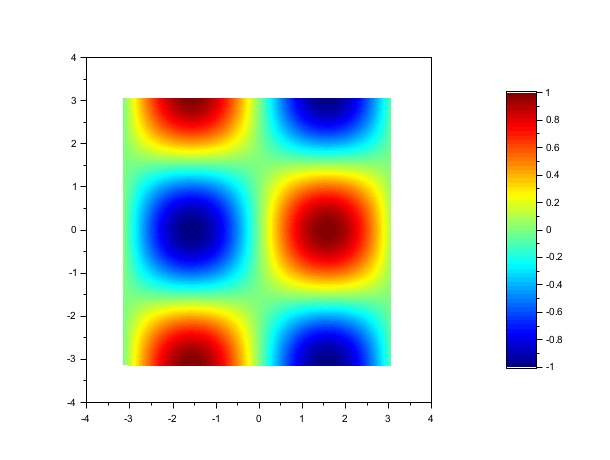 // 例 #2 t=-%pi:0.1:%pi; m=sin(t)'*cos(t); clf() gcf().color_map = jet(64); colorbar(-1,1) Sgrayplot(t,t,m, strf="041")
