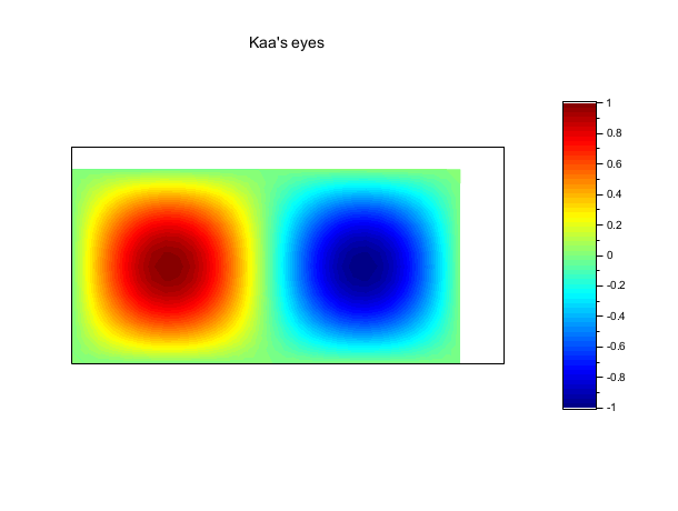 // 例 #3: アニメーション表示 cos(t)*sin(x)sin(y). n = 30; nt = 100; x = linspace(0,2*%pi,n); y = linspace(0,%pi,n/2); z = sin(x')*sin(y); t = linspace(0,4*%pi,nt); show_window(); clf() f=gcf(); f.color_map=jet(64); colorbar(-1,1) c = Sgrayplot(x,y,cos(t(1))*z, strf="042", zminmax=[-1,1]) xtitle("Kaa''s eyes") for i = 1:nt e.data(:,3)=matrix(cos(t(i))*z,-1,1); end
