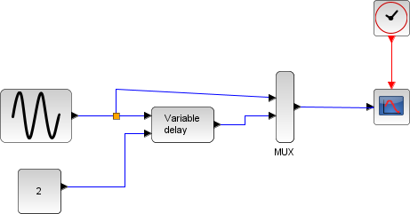このブロックは2個の入力と1個の出力を受け付けます: 最初の入力は信号 u(t) でブロックにより指定されます(データ入力); 2番目の入力は可変時間遅延 τ(t)です.