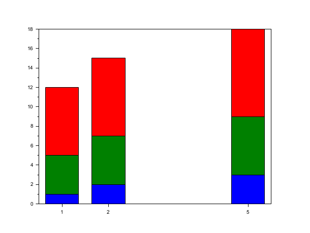 // 3番目の例 : style='stacked'. scf(2); x=[1 2 5]; y=[1 4 7;2 5 8;3 6 9]; bar(x,y,'stacked');