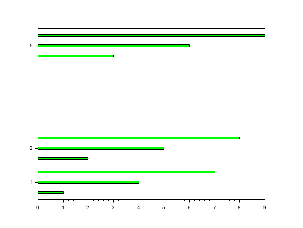 // 4番目の例: width=0.2;color='green'; default style='grouped' scf(3); x=[1 2 5]; y=[1 4 7;2 5 8;3 6 9]; barh(x,y,0.2,'green');
