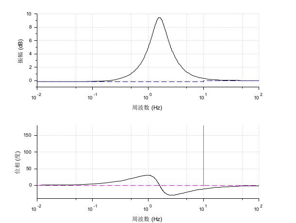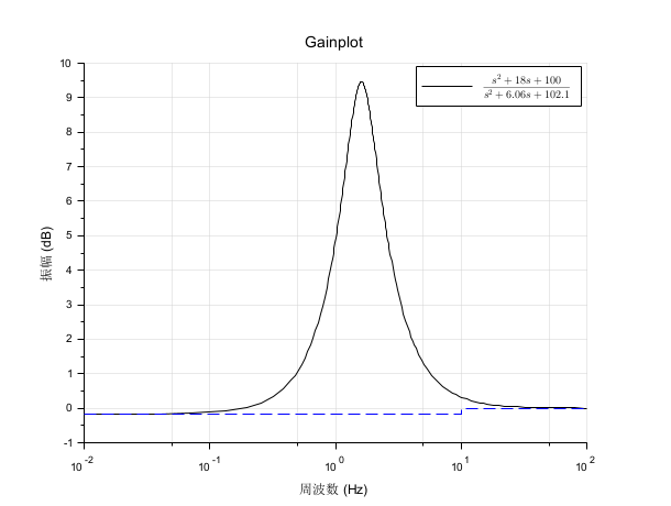 s = poly(0, "s"); h = syslin("c", (s^2+2*0.9*10*s+100)/(s^2+2*0.3*10.1*s+102.01)); h = tf2ss(h); clf(); gainplot(h, 0.01, 100, "$\frac{s^2+18 s+100}{s^2+6.06 s+102.1}$"); // 単位: ヘルツ bode_asymp(h)