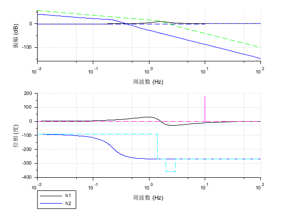 s = poly(0, "s"); h1 = syslin("c", (s^2+2*0.9*10*s+100)/(s^2+2*0.3*10.1*s+102.01)); h2 = syslin("c", (10*(s+3))/(s*(s+2)*(s^2+s+2))); clf(); bode([h1; h2], 0.01, 100, ["h1"; "h2"]); bode_asymp([h1; h2]);