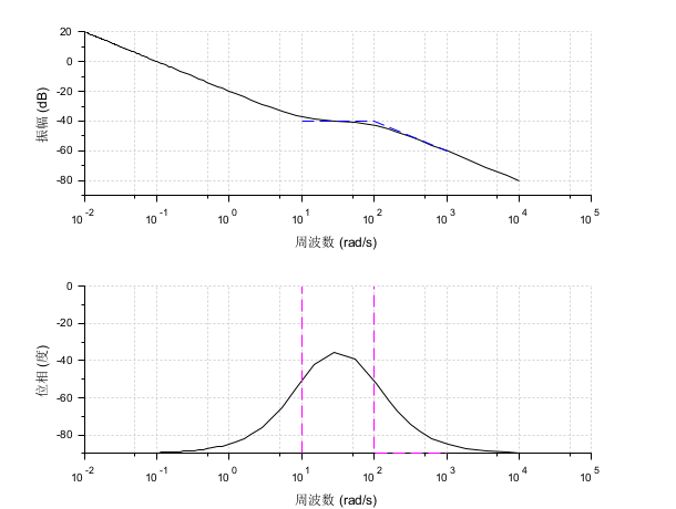 s = %s; G = (s+10)/(s*(s+100)); // 有理行列 sys = syslin("c", G); // 伝達関数表現の連続時間線形系 f_min = .0001; f_max = 1600; // 単位: Hz clf(); bode(sys, f_min, f_max, "rad"); // オプション引数 "rad" は Hzをrad/sに変換します bode_asymp(sys, 10, 1000); // 指定した範囲(単位:rad/s)で漸近線をプロット