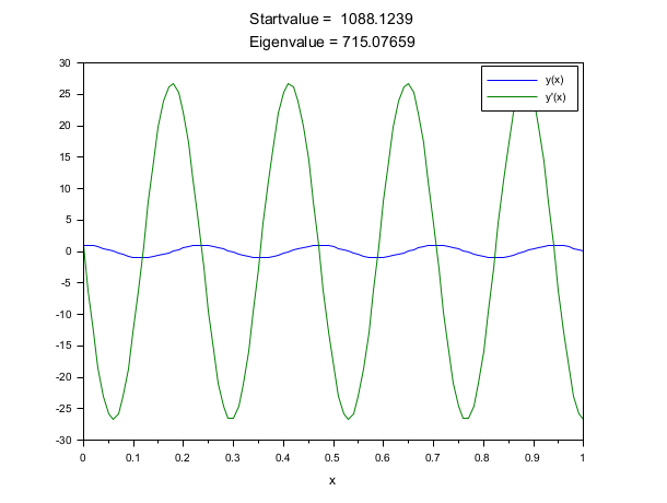 // y''(x)=-la*y(x) // BV: y(0)=y'(0); y(1)=0 // Eigenfunctions and eigenvalues are y(x,n)=sin(s(n)*(1-x)), la(n)=s(n)^2, // where s(n) are the zeros of f(s,n)=s+atan(s)-(n+1)*pi, n=0,1,2,... // To get a third boundary condition, we choose y(0)=1 // (With y(x) also c*y(x) is a solution for each constant c.) // We solve the following ode system: // y''=-la*y // la'=0 // BV: y(0)=y'(0), y(0)=1; y(1)=0 // z=[y(x) ; y'(x) ; la] function rhs=fsub(x, z) rhs=[-z(3)*z(1);0] endfunction function g=gsub(i, z) g=[z(1)-z(2) z(1)-1 z(1)] g=g(i) endfunction // The following start function is good for the first 8 eigenfunctions. function [z, lhs]=ystart(x, z, la0) z=[1;0;la0] lhs=[0;0] endfunction a=0;b=1; m=[2;1]; n=2; zeta=[a a b]; N=101; x=linspace(a,b,N)'; // We have s(n)-(n+1/2)*pi -> 0 for n to infinity. la0=input('n-th eigenvalue: n= ?'); la0=(%pi/2+la0*%pi)^2; z=bvodeS(x,m,n,a,b,fsub,gsub,zeta,ystart=list(ystart,la0)); clf() plot(x,[z(1,:)' z(2,:)']) xtitle(['Startvalue = '+string(la0);'Eigenvalue = '+string(z(3,1))],'x',' ') legend(['y(x)';'y''(x)'])