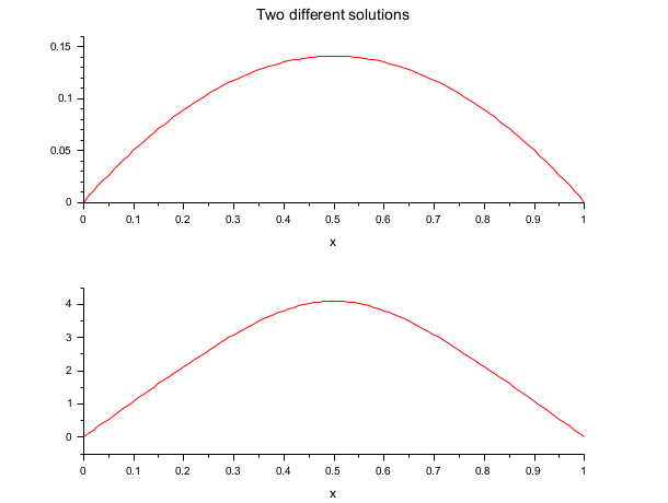 // DE: y''(x)=-exp(y(x)) // BV: y(0)=0; y(1)=0 // This boundary value problem has more than one solution. // It is demonstrated how to find two of them with the help of // some preinformation of the solutions y(x) to build the function ystart. // z=[y(x);y'(x)] a=0; b=1; m=2; n=1; zeta=[a b]; N=101; tol=1e-8*[1 1]; x=linspace(a,b,N); function rhs=fsub(x, z) rhs=-exp(z(1)); endfunction function g=gsub(i, z) g=[z(1) z(1)] g=g(i) endfunction function [z, lhs]=ystart(x, z, M) //z=[4*x*(1-x)*M ; 4*(1-2*x)*M] z=[M;0] //lhs=[-exp(4*x*(1-x)*M)] lhs=0 endfunction for M=[1 4] if M==1 z=bvodeS(x,m,n,a,b,fsub,gsub,zeta,ystart=list(ystart,M),tol=tol); else z1=bvodeS(x,m,n,a,b,fsub,gsub,zeta,ystart=list(ystart,M),tol=tol); end end // Integrating the ode yield e.g. the two solutions yex and yex1. function y=f(c) y=c.*(1-tanh(sqrt(c)/4).^2)-2; endfunction c = fsolve(2,f); function y=yex(x, c) y = log(c/2*(1-tanh(sqrt(c)*(1/4-x/2)).^2)) endfunction function y=f1(c1) y = 2*c1^2+tanh(1/4/c1)^2-1; endfunction c1 = fsolve(0.1,f1); function y=yex1(x, c1) y = log((1-tanh((2*x-1)/4/c1).^2)/2/c1/c1) endfunction disp('norm(yex(x)-z(1,:))= ', norm(z(1,:)-yex(x))) disp('norm(yex1(x)-z1(1,:))= ', norm(z1(1,:)-yex1(x))) clf(); subplot(2,1,1) plot2d(x,z(1,:),style=[5]) xtitle('Two different solutions','x',' ') subplot(2,1,2) plot2d(x,z1(1,:),style=[5]) xtitle(' ','x',' ')