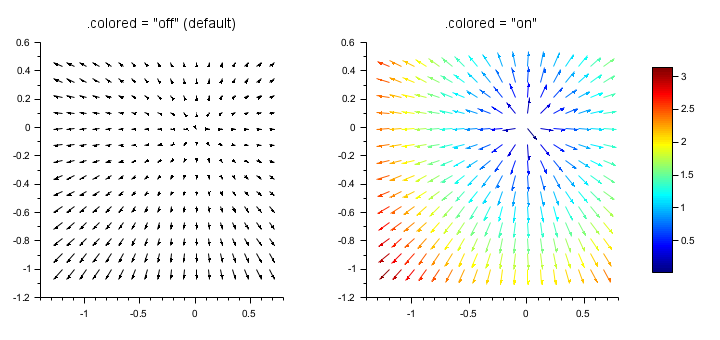 x = -1.2:0.11:0.7; y = -1:0.11:0.5; [X, Y] = ndgrid(x, y); [fx, fy] = (2*X, 2*Y); clf xsetech([0 0 0.45 1]) champ(x, y, fx, fy) title(".colored = ""off"" (default)", "fontsize",3) xsetech([0.45 0 0.55 1]) h = champ(x, y, fx, fy) title(".colored = ""on""", "fontsize",3) gcf().color_map = jet(100); colorbar