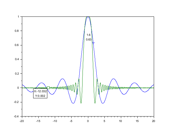 x=linspace(-20,20,1000); clf();e=plot(x,sinc(x),x,sinc(x.^2)); d1=datatipCreate(e(1),540); function str=mydisplay(h) pt = h.data; str=msprintf('%0.2g \n %0.2g', pt(1), pt(2)) endfunction datatipSetDisplay(d1,"mydisplay") datatipSetStyle(e(1),2,%f) datatipSetOrientation(d1,"upper left"); d2=datatipCreate(e(2),200); datatipSetStyle(e(2),1,%t) datatipSetOrientation(d2,"lower left");