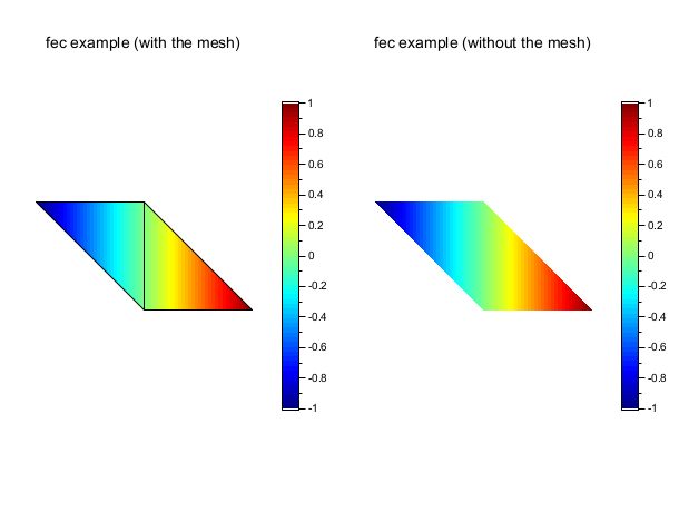// 小規模な三角形分割を定義 (頂点:4, 三角形:2 ) x = [0 1 0 -1]; y = [0 0 1 1]; T = [1 1 2 3 1; 2 3 4 1 1]; z = [0 1 0 -1]; // 各頂点における関数の値 clf() gcf().color_map = jet(64); subplot(1,2,1) colorbar(-1,1) fec(x,y,T,z,strf="040",mesh=%t) xtitle("fec example (with the mesh)") subplot(1,2,2) colorbar(-1,1) fec(x,y,T,z,strf="040") // rmq:デフォルトでは mesh=%f xtitle("fec example (without the mesh)") show_window()