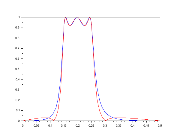 hz=iir(3,'bp','cheb1',[.15 .25],[.08 .03]); [hzm,fr]=frmag(hz,256); plot(fr,hzm) hz=iir(3,'bp','ellip',[.15 .25],[.08 .03]); [hzm,fr]=frmag(hz,256); plot(fr,hzm,'r')