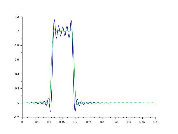 // fsfirlinマクロの周波数標本法によるFIRフィルタ設計への適用例 // // 2つのフィルタを設計します: 最初のフィルタ(応答 hst1)は // 通過域と阻止域の間で0から1までの急峻な遷移を有します; // 2番目のフィルタ(応答 hst2)は平滑化のために各遷移域に1個の // 標本(振幅 0.5)を有します. // hd=[zeros(1,15) ones(1,10) zeros(1,39)];// 目標とする標本 hst1=fsfirlin(hd,1);// 遷移域に標本がないフィルタ hd(15)=.5;hd(26)=.5;// 遷移域の標本 hst2=fsfirlin(hd,1);// 対応するフィルタ pas=1/prod(size(hst1))*.5; fg=0:pas:.5;// 正規化した周波数グリッド plot2d([1 1].*.fg(1:257)',[hst1' hst2']); // 2番目の例 hd=[0*ones(1,15) ones(1,10) 0*ones(1,39)];// 目標とする標本 hst1=fsfirlin(hd,1);// 遷移域に標本がないフィルタ hd(15)=.5;hd(26)=.5;// 遷移域の標本 hst2=fsfirlin(hd,1);// 対応するフィルタ pas=1/prod(size(hst1))*.5; fg=0:pas:.5;// 正規化した周波数グリッド n=prod(size(hst1)) plot(fg(1:n),hst1); plot2d(fg(1:n)',hst2',[3],"000");