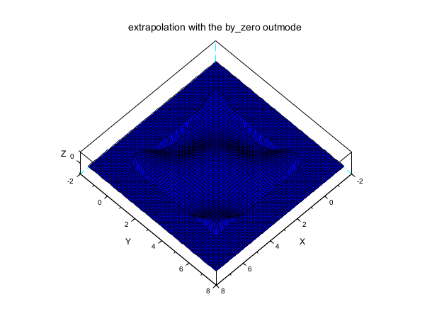 n = 7; // a n x n interpolation grid x = linspace(0,2*%pi,n); y = x; z = cos(x')*cos(y); C = splin2d(x, y, z, "periodic"); // now evaluate on a bigger domain than [0,2pi]x [0, m = 80; // discretization parameter of the evaluation grid xx = linspace(-0.5*%pi,2.5*%pi,m); yy = xx; [XX,YY] = ndgrid(xx,yy); zz2 = interp2d(XX,YY, x, y, C, "by_zero"); plot3d(xx, yy, zz2, flag=[2 6 4]) xtitle("extrapolation with the by_zero outmode")