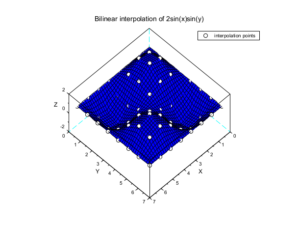 // 例 2 : 双線形補間 n = 8; x = linspace(0,2*%pi,n); y = x; z = 2*sin(x')*sin(y); xx = linspace(0,2*%pi, 40); [xp,yp] = ndgrid(xx,xx); zp = linear_interpn(xp,yp, x, y, z); clf() plot3d(xx, xx, zp, flag=[2 6 4]) [xg,yg] = ndgrid(x,x); param3d1(xg,yg, list(z,-9*ones(1,n)), flag=[0 0]) xtitle("Bilinear interpolation of 2sin(x)sin(y)") legends("interpolation points",-9,1) show_window()