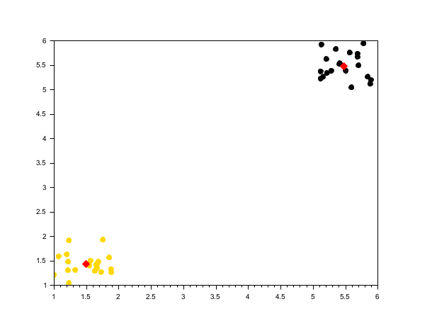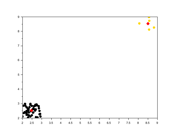 rand("seed", 0) n = 20; X1 = [rand(n, 2) + 1; rand(n, 2) + 5]; [centers1, labels1] = meanshift(X1, 1); scf(); scatter(X1(:,1), X1(:,2), [], labels1, "fill"); plot(centers1(:,1), centers1(:,2), 'r*', "markersize", 10, "thickness", 3);