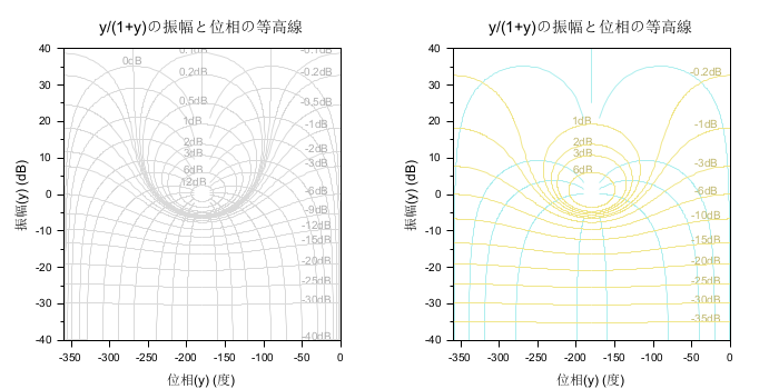 //ニコルス線図 clf() subplot(1,2,1) nicholschart(); subplot(1,2,2) mod = [-35:5:-10 -6 -3 -1 -0.2 1 2 3 6]; nicholschart(mod, -[1 20 40 80 160 180],["khaki" "paleturquoise"]);