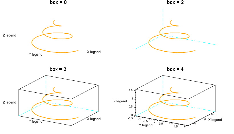 t = (0:0.1:5*%pi)'; r = (max(t)-t)/10; x = r.*sin(t); y = r.*cos(t); z = list(t/10, color("orange")); Box = [0 2 3 4]; clf for i = 1:4 subplot(2,2,i) param3d1(x, y, z, 31, 72,"X legend@Y legend@Z legend",[4, Box(i)]) title(msprintf("box = %d",Box(i)), "fontsize", 4) end gcf().children.children.thickness = 2; // for the 4 curves in a once gca().sub_ticks = [4 4 4]; // only for the last axes