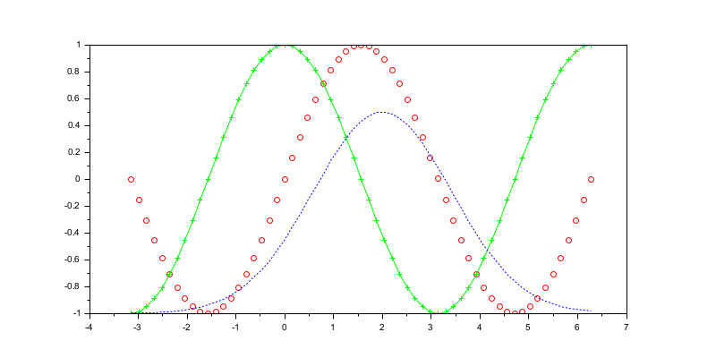 clf t = -%pi:%pi/20:2*%pi; // sin() : in Red, with O marks, without line // cos() : in Green, with + marks, with a solid line // gaussian: in Blue, without marks, with dotted line gauss = 1.5*exp(-(t/2-1).^2)-1; plot(t,sin,'ro', t,cos,'g+-', t,gauss,':b')