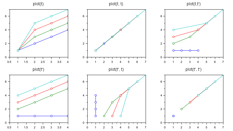 clf t = [1 1 1 1 2 3 4 5 3 4 5 6 4 5 6 7]; subplot(231), plot(t,"o-") , title("plot(t)", "fontsize",3) subplot(234), plot(t',"o-"), title("plot(t'')", "fontsize",3) subplot(232), plot(t,t,"o-") , title("plot(t, t)", "fontsize",3) subplot(233), plot(t,t',"o-"), title("plot(t,t'')", "fontsize",3) subplot(235), plot(t', t,"o-"), title("plot(t'', t)", "fontsize",3) subplot(236), plot(t', t',"o-"), title("plot(t'', t'')", "fontsize",3) for i=1:6, gcf().children(i).data_bounds([1 3]) = 0.5; end
