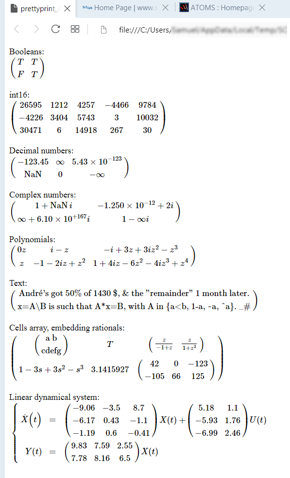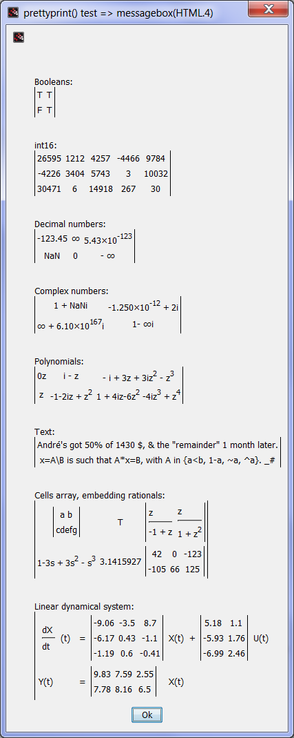 bool = [ %t %t ; %f %t ] i16 = int16([ 26595 1212 4257 -4466 9784 -4226 3404 5743 3 10032 30471 6 14918 267 30 ]) num = [-123.45, %inf, 5.427e-123 %nan , 0 , -%inf ] cx = [complex(1,%nan), complex(-1.25d-12, 2) complex(%inf,6.1e167), complex(1,-%inf)] p = [[0*%z ; %z], (%i-%z).^[1 3;2 4]]; string(p) text = ["André''s got 50% of 1430 $, & the ""remainder"" 1 month later." "x=A\B is such that A*x=B, with A in {a<b, 1-a, ~a, ^a}. _#"] ce = {["a b"; "cdefg"], %t, %z./[%z-1, %z^2+1] ; (1-%s)^3, %pi, int8(rand(2,3)*200)} A = grand(3,3,"uin",-999,999)/100; B = grand(3,2,"uin",-999,999)/100; C = grand(2,3,"uin",-999,999)/100; linsys = syslin("c", A, B, C); L = list("Booleans:", bool, "int16:", i16, "Decimal numbers:", num, .. "Complex numbers:", cx, "Polynomials:", p, "Text:", text, .. "Cells array, embedding rationals:", ce, "Linear dynamical system:");