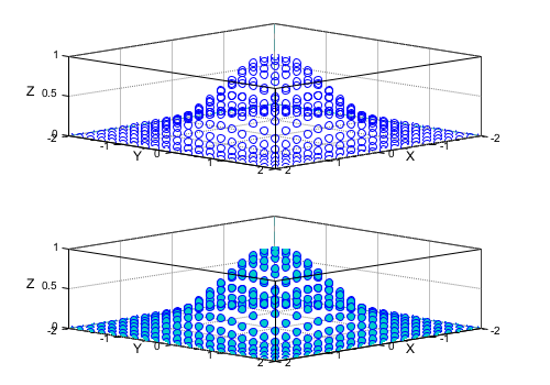 // Data n = 20; [x, y] = meshgrid(linspace(-2, 2, n)); z = exp(-x.^2 - y.^2); subplot(2,1,2) axes2 = gca(); subplot(2,1,1) scatter3d(x, y, z); scatter3d(axes2, x(:), y(:), z(:), "markerFaceColor", [0 .8 .8]); // Tune axes view Axes = gcf().children; Axes.rotation_angles = [60,45]; Axes.grid = [1 1 1]*color("grey50");