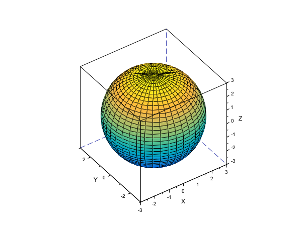 scf(); [x, y, z] = sphere(40); surf(3 * x, 3 * y, 3 * z); gcf().color_map = parula(64); gca().isoview = "on";
