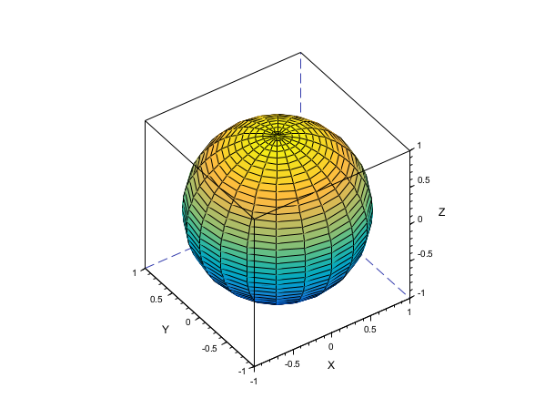 scf(); [x, y, z] = sphere([20 40]); surf(x, y, z); gcf().color_map = parula(64); gca().isoview = "on";