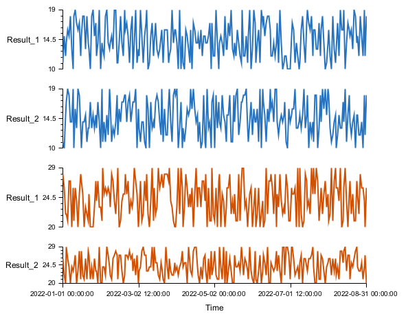 t = datetime(2022, 1, 1):datetime(2022, 8, 31); n = size(t, "*"); y1 = floor(10 * rand(n, 2)) + 10; ts1 = timeseries(t, y1(:, 1), y1(:, 2), "VariableNames", ["Time", "Result_1", "Result_2"]); y2 = floor(10 * rand(n, 2)) + 20; ts2 = timeseries(t, y2(:, 1), y2(:, 2), "VariableNames", ["Time", "Result_1", "Result_2"]); stackedplot(ts1, ts2); stackedplot(ts1, ts2, "CombineMatchingNames", %f);