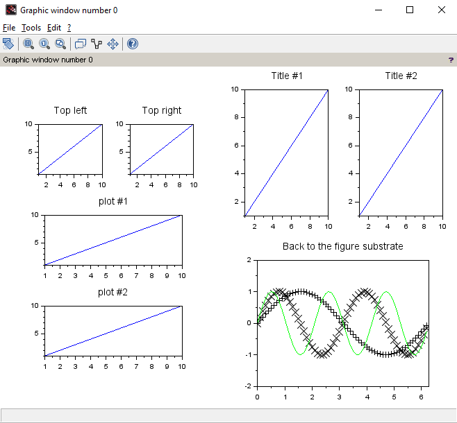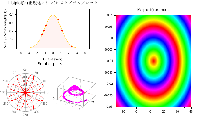 clf subplot(1,2,2) Matplot1() xtitle("Matplot1() example","","") subplot(2,2,1) histplot delete(findobj("type","Legend")) subplot(2,2,3) title("Smaller plots:", "fontsize",3) subplot(2,4,5) polarplot() subplot(2,4,6) param3d() xtitle("","","","")