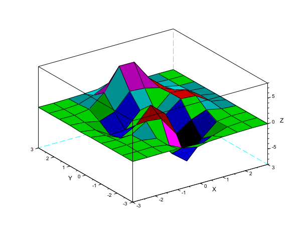// X および Y の初期化 // NB: here, X has the same lines and Y the same columns X=[-3.0000 -2.3333 -1.6667 -1.0000 -0.3333 0.3333 1.0000 1.6667 2.3333 3.0000 -3.0000 -2.3333 -1.6667 -1.0000 -0.3333 0.3333 1.0000 1.6667 2.3333 3.0000 -3.0000 -2.3333 -1.6667 -1.0000 -0.3333 0.3333 1.0000 1.6667 2.3333 3.0000 -3.0000 -2.3333 -1.6667 -1.0000 -0.3333 0.3333 1.0000 1.6667 2.3333 3.0000 -3.0000 -2.3333 -1.6667 -1.0000 -0.3333 0.3333 1.0000 1.6667 2.3333 3.0000 -3.0000 -2.3333 -1.6667 -1.0000 -0.3333 0.3333 1.0000 1.6667 2.3333 3.0000 -3.0000 -2.3333 -1.6667 -1.0000 -0.3333 0.3333 1.0000 1.6667 2.3333 3.0000 -3.0000 -2.3333 -1.6667 -1.0000 -0.3333 0.3333 1.0000 1.6667 2.3333 3.0000 -3.0000 -2.3333 -1.6667 -1.0000 -0.3333 0.3333 1.0000 1.6667 2.3333 3.0000 -3.0000 -2.3333 -1.6667 -1.0000 -0.3333 0.3333 1.0000 1.6667 2.3333 3.0000]; Y=[-3.0000 -3.0000 -3.0000 -3.0000 -3.0000 -3.0000 -3.0000 -3.0000 -3.0000 -3.0000 -2.3333 -2.3333 -2.3333 -2.3333 -2.3333 -2.3333 -2.3333 -2.3333 -2.3333 -2.3333 -1.6667 -1.6667 -1.6667 -1.6667 -1.6667 -1.6667 -1.6667 -1.6667 -1.6667 -1.6667 -1.0000 -1.0000 -1.0000 -1.0000 -1.0000 -1.0000 -1.0000 -1.0000 -1.0000 -1.0000 -0.3333 -0.3333 -0.3333 -0.3333 -0.3333 -0.3333 -0.3333 -0.3333 -0.3333 -0.3333 0.3333 0.3333 0.3333 0.3333 0.3333 0.3333 0.3333 0.3333 0.3333 0.3333 1.0000 1.0000 1.0000 1.0000 1.0000 1.0000 1.0000 1.0000 1.0000 1.0000 1.6667 1.6667 1.6667 1.6667 1.6667 1.6667 1.6667 1.6667 1.6667 1.6667 2.3333 2.3333 2.3333 2.3333 2.3333 2.3333 2.3333 2.3333 2.3333 2.3333 3.0000 3.0000 3.0000 3.0000 3.0000 3.0000 3.0000 3.0000 3.0000 3.0000]; Z= [0.0001 0.0013 0.0053 -0.0299 -0.1809 -0.2465 -0.1100 -0.0168 -0.0008 -0.0000 0.0005 0.0089 0.0259 -0.3673 -1.8670 -2.4736 -1.0866 -0.1602 -0.0067 0.0000 0.0004 0.0214 0.1739 -0.3147 -4.0919 -6.4101 -2.7589 -0.2779 0.0131 0.0020 -0.0088 -0.0871 0.0364 1.8559 1.4995 -2.2171 -0.2729 0.8368 0.2016 0.0130 -0.0308 -0.4313 -1.7334 -0.1148 3.0731 0.4444 2.6145 2.4410 0.4877 0.0301 -0.0336 -0.4990 -2.3552 -2.1722 0.8856 -0.0531 2.6416 2.4064 0.4771 0.0294 -0.0137 -0.1967 -0.8083 0.2289 3.3983 3.1955 2.4338 1.2129 0.2108 0.0125 -0.0014 -0.0017 0.3189 2.7414 7.1622 7.1361 3.1242 0.6633 0.0674 0.0030 0.0002 0.0104 0.1733 1.0852 2.6741 2.6725 1.1119 0.1973 0.0152 0.0005 0.0000 0.0012 0.0183 0.1099 0.2684 0.2683 0.1107 0.0190 0.0014 0.0000]; scf(3) surf(X,Y,Z)